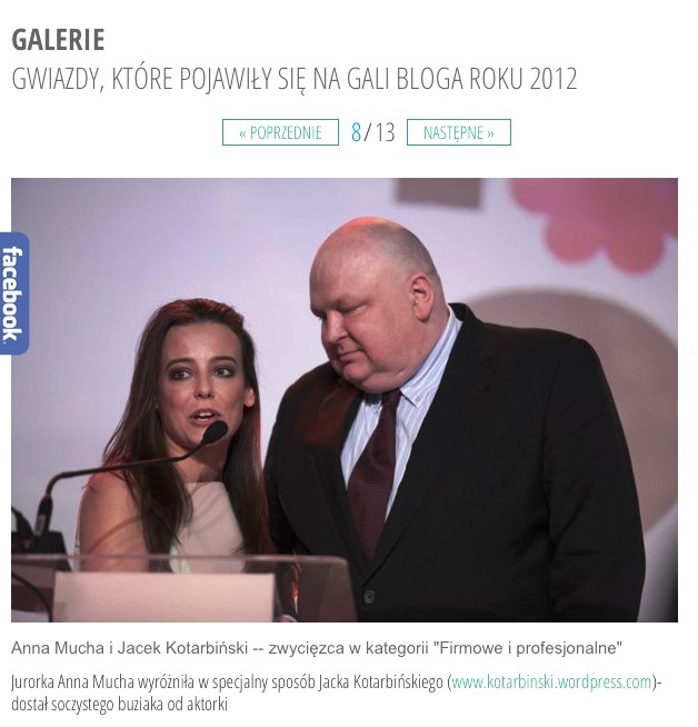 Pani Anna Mucha doceniła mój blog w sposób szczególny. Wyraziła to poprzez przyznanie osobistego wyróżnienia podczas gali Blog Roku 2012. Jestem jej niezmiernie wdzięczny za to uznanie, a otrzymane buziaki traktuję w sposób wyjątkowy. Dziękuję Pani Aniu za te szczególne słowa.