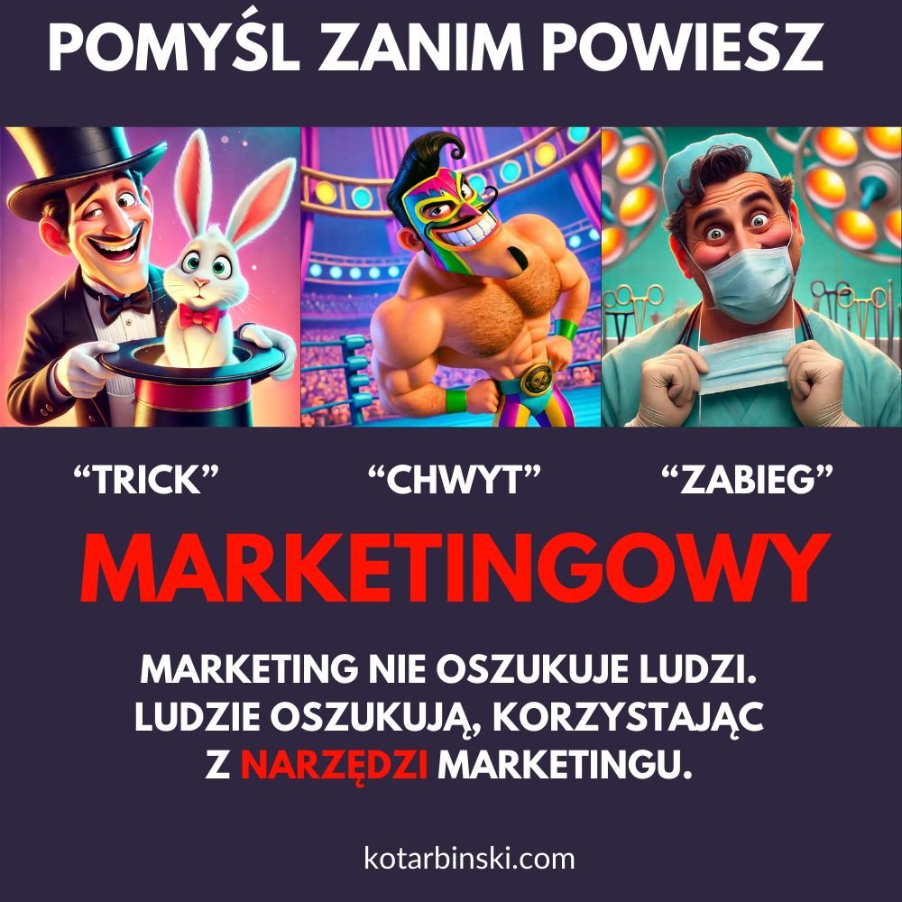Techniki marketingowe (rozumiane jako taktyki marketingowe) są technikami wywierania wpływu, a nie manipulacji. Profesor Philip Kotler w książce “Marketing 6.0” MT Biznes, 2024 zdefiniował kluczową ideę: “Celem marketing jest poprawa ludzkiego życia i przyczynianie się do powszechnego dobrostanu”. Problemem jest to, że w komunikacji społecznej częściej słychać o nieetycznych działaniach marketingowych, jesteśmy manipulowani fałszywą reklamą, ulegamy praktykom opartym o „trzepanie kasy”, jesteśmy ewidentnie oszukiwani lub ulegamy emocjom związanym z syndromem metki. Powodem jest bardzo niski poziom edukacji społecznej w wymiarze ekonomicznym, w tym powszechna wiedza dotycząca zachowań konsumenckich, technik marketingowych, etyki biznesu i szeregu innym elementów naszego codziennego życia. Agresywne, piorące mózg reklamy postrzegamy w wymiarze pejoratywnym (czemu wcale się nie dziwię), a oszukańcze praktyki biznesowe zrzucamy na karb tego „przeklętego marketingu”. Tymczasem po raz kolejny i z uporem maniaka podkreślam: to nie marketing oszukuje ludzi, tylko ludzie oszukują korzystając z arsenału narzędzi marketingu.