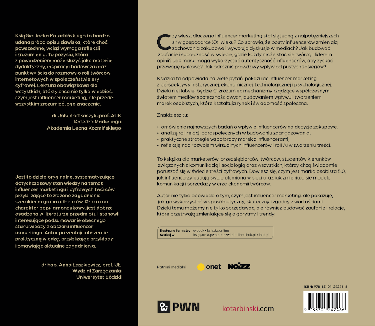 “Książka Jacka Kotarbińskiego to bardzo udana próba opisu zjawiska, które choć powszechne, wciąż wymaga refleksji i zrozumienia. To pozycja, która z powodzeniem może służyć jako materiał dydaktyczny, inspiracja badawcza oraz punkt wyjścia do rozmowy o roli twórców internetowych w społeczeństwie ery cyfrowej. Lektura obowiązkowa dla wszystkich, którzy chcą nie tylko wiedzieć, czym jest influencer marketing, ale przede wszystkim zrozumieć jego znaczenie.”