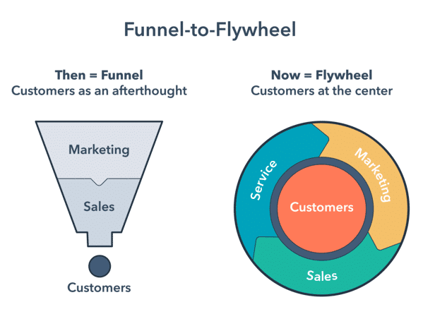 Model Flywheel Marketing w przeciwieństwie do lejka sprzedażowego stawia klientów (a nie produkt) w centrum strategii marketingu i sprzedaży, stając się sercem zadowolenia klientów i kluczem do budowania ich zaangażowania.
