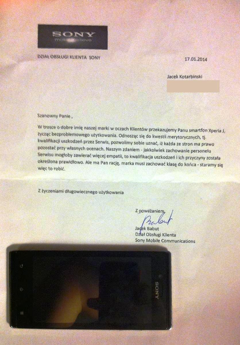Marka zachowała się godnie. Otrzymałem nowy telefon wraz z listem z Działu Obsługi Klienta.